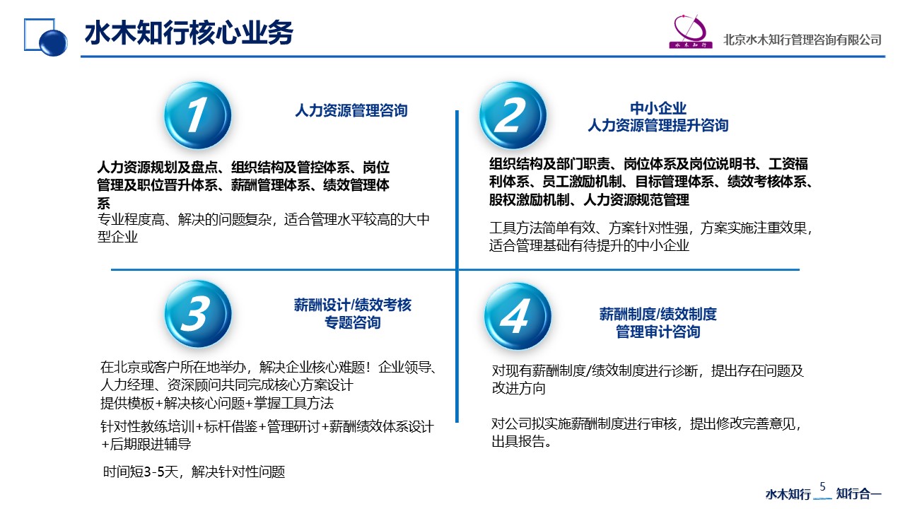 北京水木知行管理咨詢有限公司(www.bjsmzx_com.699mir.cn)專注提供人力資源管理咨詢、人力資源管理培訓、人力資源招聘咨詢、人力資源獵頭服務業務;咨詢業務范圍包括組織結構與管控體系、崗位管理體系、薪酬管理體系、績效管理體系,咨詢形式包括全過程咨詢、教練式咨詢和特訓班;培訓業務包括企業基礎管理...[詳情]